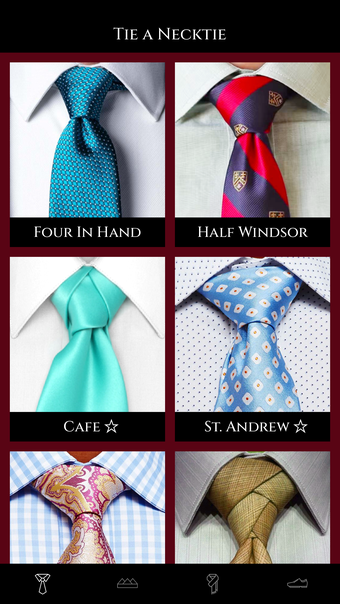 Приложение предлагает различные методы завязывания галстука, включая популярные варианты, такие как узел "Four In Hand", узел "Half Windsor" и узел "Windsor". Оно также включает более уникальные варианты, такие как узел "Элдредж", узел "Троица" и узел "Онассис", позволяя пользователям экспериментировать с различными стилями. Каждый метод подробно объясняется, что делает его легким для следования и овладения искусством завязывания галстука.